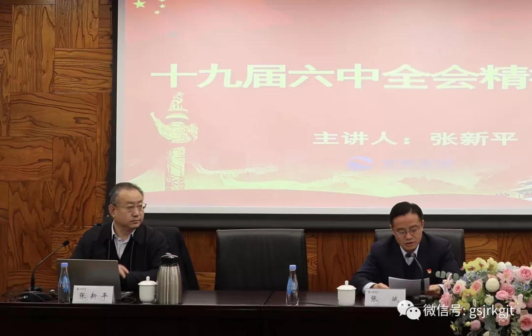 為深入學(xué)習(xí)貫徹黨的十九屆六中全會(huì)精神, 11月30日上午,甘肅金控集團(tuán)邀請(qǐng)?zhí)m州大學(xué)馬克思主義學(xué)院張新平教授,舉辦十九屆六中全會(huì)精神專題輔導(dǎo)講座。集團(tuán)黨委書記、董事長(zhǎng)祁建邦及在家班子成員參加講座。集團(tuán)黨委副書記、工會(huì)主席張斌主持并講話。