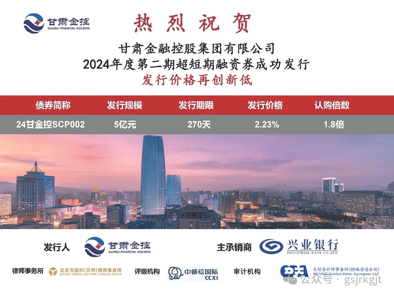 2024年6月4日,甘肅金融控股集團有限公司成功發行2024年度第二期超短期融資券,發行規模5億元,債券期限270天,票面利率2.23%,再創發行超短期融資券利率新低。