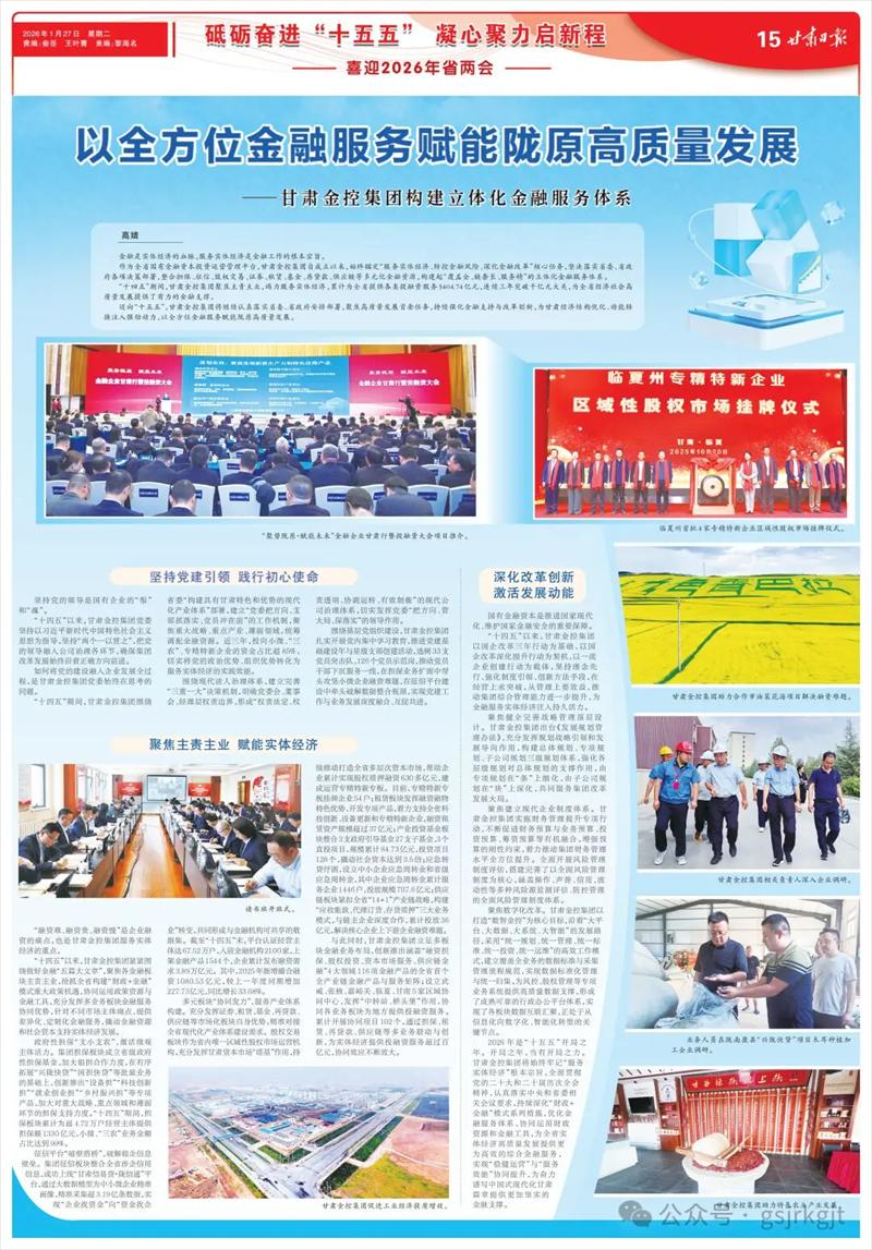 2026年是“十五五”開局之年。開局之年,當(dāng)有開局之力。甘肅金控集團(tuán)將始終牢記“服務(wù)實(shí)體經(jīng)濟(jì)”根本宗旨,全面貫徹黨的二十大和二十屆歷次全會(huì)精神,認(rèn)真落實(shí)中央和省委相關(guān)會(huì)議要求,持續(xù)深化“財(cái)政+金融”模式系列措施,優(yōu)化金融服務(wù)體系,協(xié)同運(yùn)用財(cái)政資源和金融工具,為全省實(shí)體經(jīng)濟(jì)高質(zhì)量發(fā)展提供更為高效的綜合金融服務(wù),實(shí)現(xiàn)“穩(wěn)健運(yùn)營”與“服務(wù)效能”協(xié)同提升,為奮力譜寫中國式現(xiàn)代化甘肅篇章提供更加堅(jiān)實(shí)的金融支撐。(高婧)