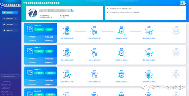近日,金控擔保電子投標保函系統在臨夏公共資源交易中心首發試點上線,金控臨夏擔保當日開出第一單電子投標保函。截至8月9日,在線開具電子投標保函共19筆、金額275萬元,實現了1分鐘線上保函開具,做到了“數據多跑腿、群眾不跑路”。