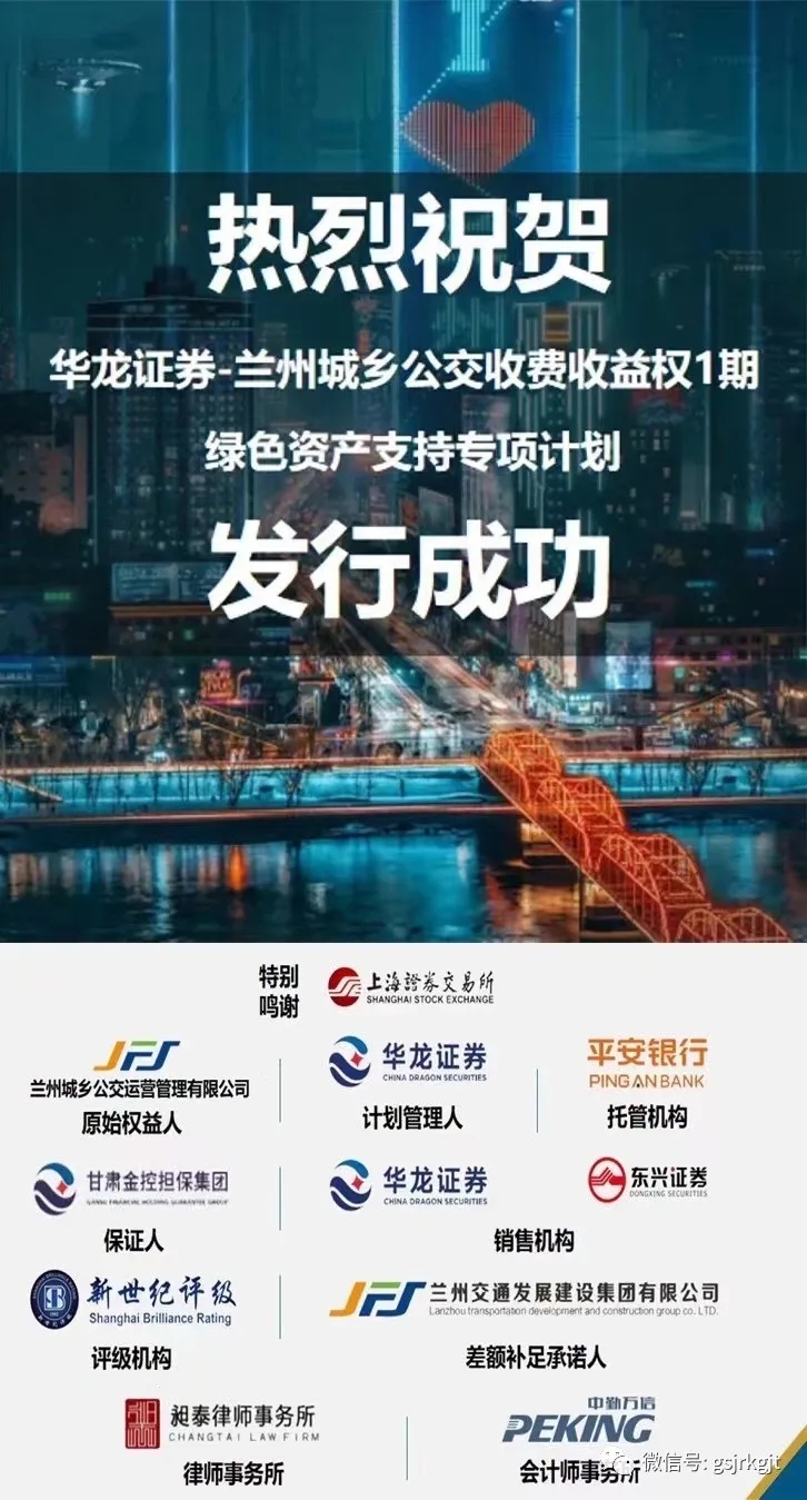 日前,由金控擔保作為保證人、華龍證券擔任計劃管理人的“蘭州城鄉公交收費收益權1期綠色資產支持專項計劃”成功發行,這也是甘肅首單綠色資產支持專項計劃。
